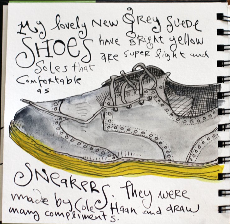 I was still wrestling with how to capture the lovely grey suede of my new shoe, so I hauled out my Daniel Smith paints and used a grey, Sodialite Genuine, keeping things fairly flat as I really wanted to make a drawing rather than a painting. Next I added a coat or two of Cadmium Yellow and a dash of Doctor Martin’s lemon yellow for good measure (I bought these shoes primarily for their canary yellow, delightfully cushioned soles).