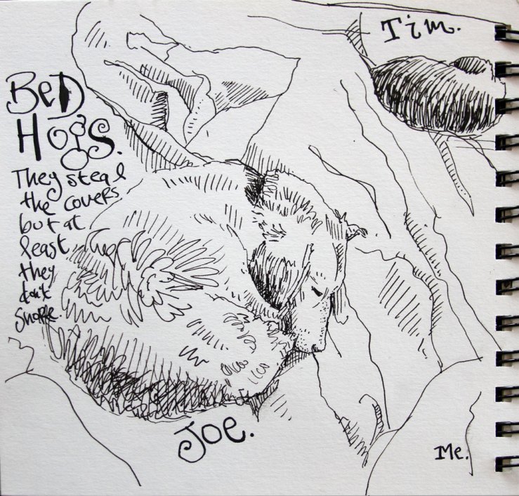 3. I love this drawing, Danny! It reminds me so much of my own dogs ‘cos they sleep in my bed too…as it’s winter here, one of them like to actually dig in under the blankets to sleep. He likes to snuggle up next to me where, sometimes, I feel like I’m right on the edge of the bed while they hog the rest. lol