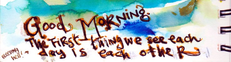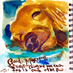 There is a tender softness to this….perhaps you should try this more often, drawing through the blur….It’s early enough that I can’t read it through my own blur, so I thought the spidery muck was my own early morning vision… Seriously, that dog’s smile is enough to start the day out right..