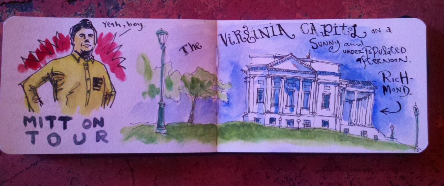 I looked through some of my old travel journals and realized that what I have been missing in my recent drawings is the interaction between different drawings, the flow of events as I capture them, different drawings done in different places butted up against each other. I’ve been doing these morning edm drawings in a specially designated book, one per page and I have lost a lot of that antic energy I like. So on our trip to Appalachia, Jack and I are both drawing in smaller moleskines and I’m using a smaller pen (usually a PITT XS). I have my super tiny paint set and a water brush. It’s a whole new set of challenges using a finite set of art supplies and tiny ones at that and it is making things new again. All that is of course multiplied by being in a new place and seeing things through fresh eyes.