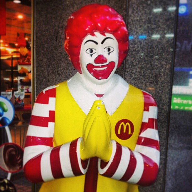 This page is a bit of  a hodge-podge.  The drawing of me on the right was done in the rain,  by a street artist who charged me 100 baht ($3).  I was horrified by how paunchy he made me look and wondered if I should have tipped him much more. The drawing of the bunny dressed in a clown costume came from a photo I took in the market— I drew it later in my room and added some gouache.  The bowing Thai lady I made up but she looks quite typical.   Even Ronald bows like this in Bangkok: