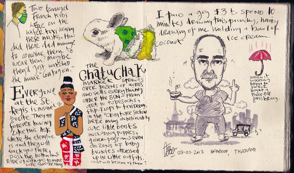 As you can tell by the diminishing quality of my pages, Thailand wore me down. It is hot, noisy, crowded and I was thoroughly over Thai food and stilted English by the time we left.  It can be hard mixing business and drawing but I’m glad I have  a record of the trip and quite pleased with a few of my pages. I stretched myself with some new materials and some stylistic experiments. I’m scheduled to go back in a couple of months. Maybe I’ll try oils.