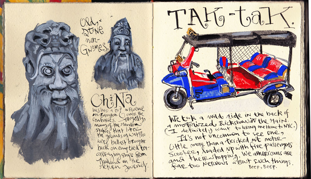 I made this spread days before I left, when I was getting excited about the trip and was imagining where I would go. I looked up stuff on the Internet and practiced my Thai calligraphy.  I laid down a super rough square of gouache with a dry brush, then painted a map on top of it with black and white ink. I smeared a stroke of glue stick across the top of the right hand page, then rubbed down a sheet of gold.  It doesn’t scan well but looks great and Siamese in the book.Thai-03