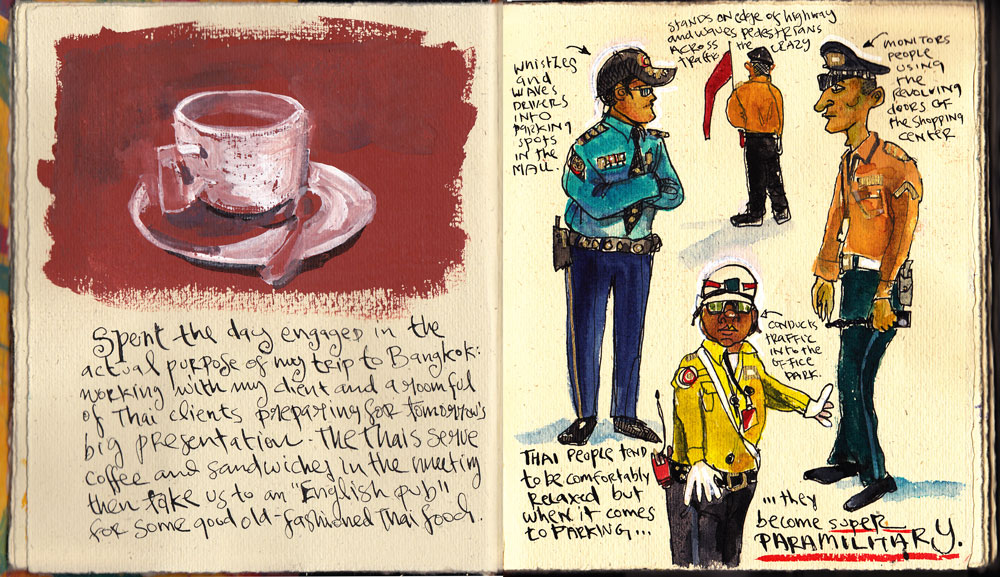 On the left,  I got a chance to be a little a painterly, working from observation, thick and wet on wet. The right hand side is very cartoony, but it captures all these absurd parking attendants in their uniforms, bossing cars around the parking lots. Thai-15