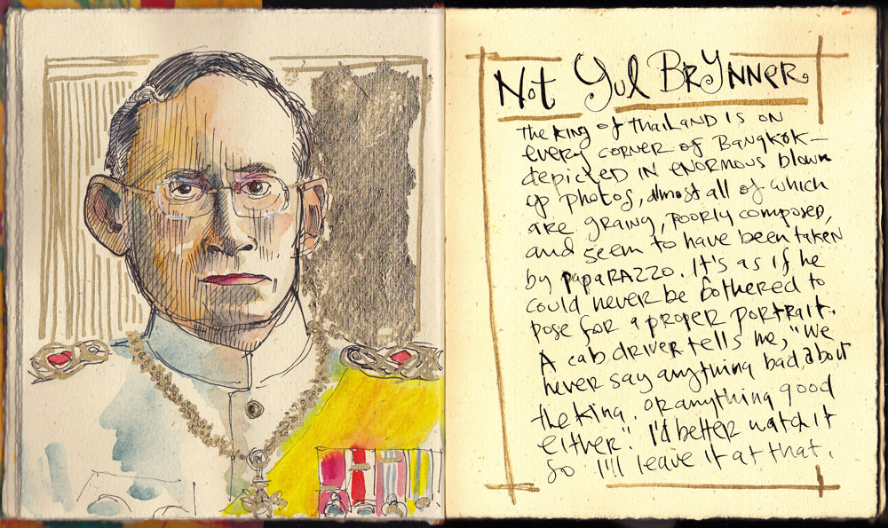 The next morning, still a little dazed, I illustrated my thoughts with a quick made-up drawing of boxers. Later, on the way to the airport, I drew a young woman on the back of a man’s scooter and wrote about why it had perplexed me. In my haste, I didn’t hold my book the right way up.Thai-19I only drew the ubiquitous king once I was safely out of the country. I’d wanted to draw him all along but had fantasies of being pulled aside at the airport and made to explain my crummy likeness. He does have enormous ears and a generally unfriendly and unroyal air, more like a dull CEO.  This is done in gouache and gold paint pen.