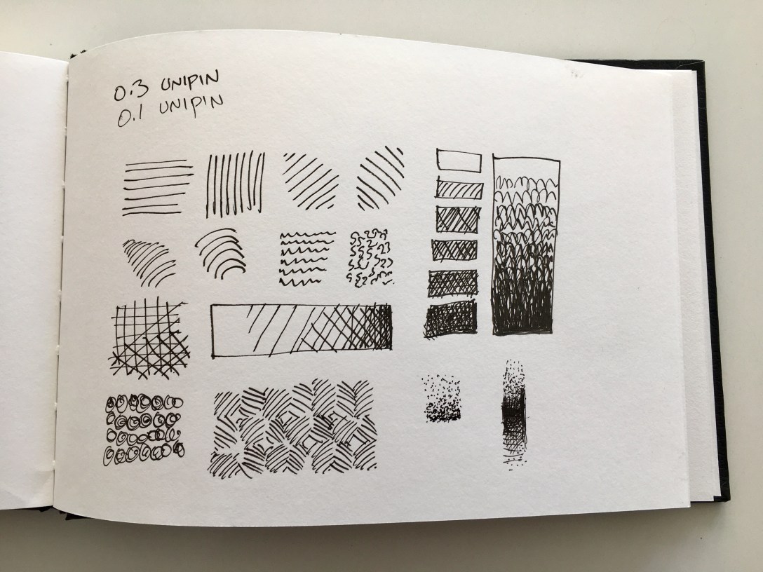 Then I do some experiments to show you how light changes mood and meaning, and how you can represent shades and colors using plain old black ink on white paper. Also how to indicate different materials, from glass to grass, skin to bricks, using just lines and dots.