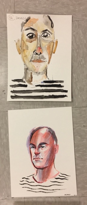 We stretched, packed up our supplies and built the grid of drawings on the floor. Each artist’s worked was arranged on the horizontal and each subject’s portraits were lined up along the vertical. I could compare all of the interpretations of a single face, turning slowly in space and see the similarities and the differing styles. It was fascinating.