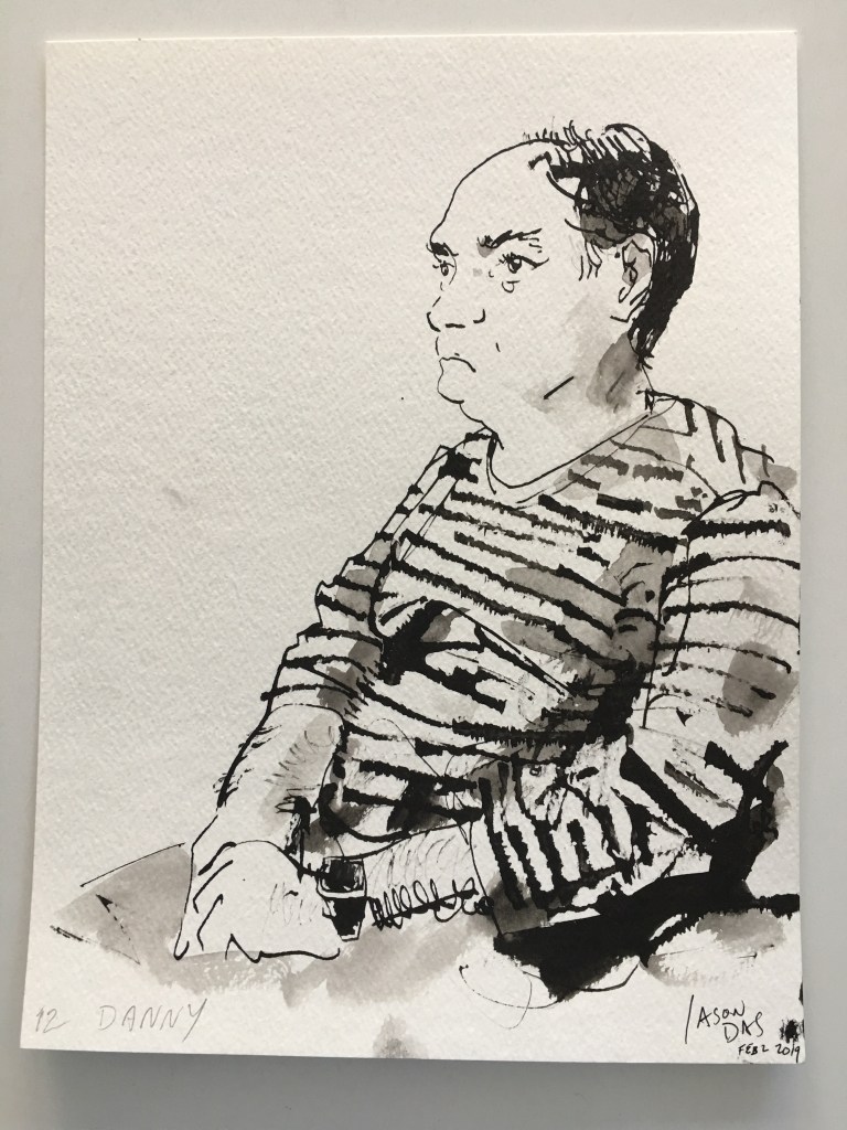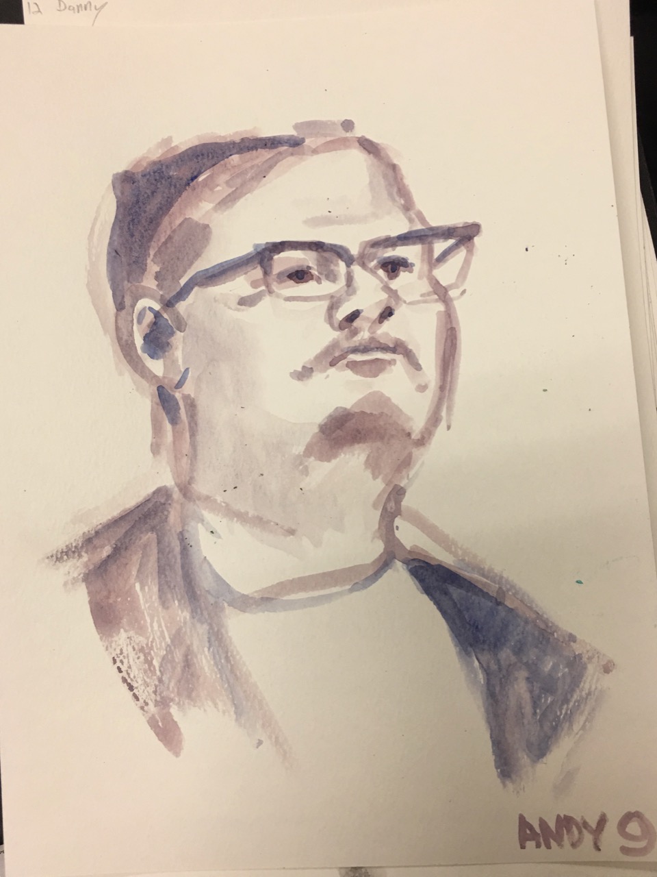 On my ninth drawing, I decided not to combine media any more. I’d just draw Andy with my watercolor brush. I’d put down diluted paint for my first impressions, then heavy up the color for some volume and more considered lines, and I could wash away any egregious lines and start again when necessary. The Strathmore paper could take it. This decision made me a lot happier with the remaining drawings and then it was my turn to be the 12th and final model.