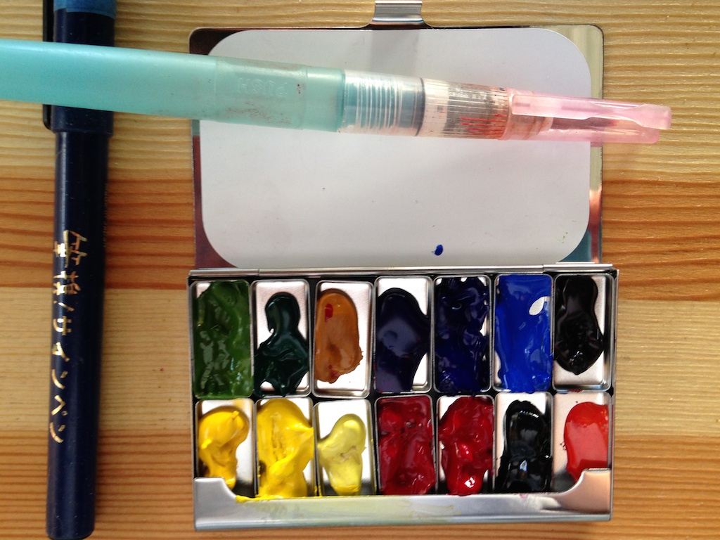 IMG_1693And speaking of my palette, Maria Coryell-Martin just sent me a credit card-sized metal palette with a magnetic base into which you can swap pans of watercolor.  There are two sizes of pans and they all snap into place in this sleek little package. I just filled it up with my favorite tube paints and am ready to try it out. I am curious about how the mixing surface will work. Maria is an expeditionary artist who has painted in some amazing places and this invention seems quite genius. If you’d like one of your own, visit her shop.