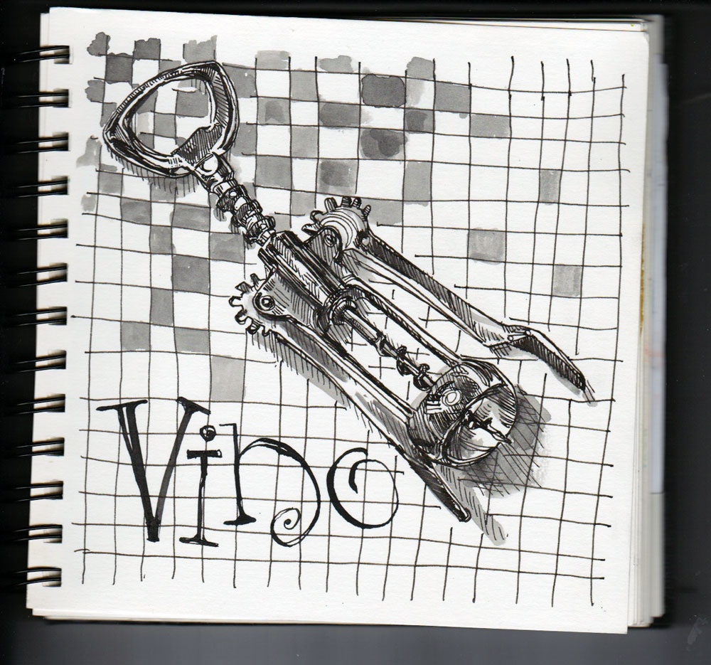 This is the work of my fine Lamy Safari and a hint of sumi ink. But most of the credit goes to patience, to slowing way, way down and just enjoying the calm that enveloped me and my desk. I drew this last night as Jack was at a concert in Brooklyn and my dogs were working on rawhide bones at my feet. The Dixon Brothers (Howard and Dorsey) sang about Jesus, whiskey and penury from my speakers and the air conditioner hummed in the corner. I studied each reflection in the corkscrew, breaking it down to three or four tones and carefully recording them.