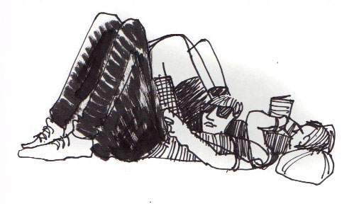 The weekend arrived and Jenny and the dogs and I went to the park. While my family dozed on a picnic blanket, I drew people. Fat, tall, crazy, slow-moving, sleeping, texting, skateboarding people filled my pages. Even the slowest were too unpredictable for me to do a lot of strategizing. I just drew and, if they got up off the bench, I started drawing the next person who sat down. The shadows grew longer, people got sweatier, Jenny and the dogs when back to the air-conditioning, while I kept going.