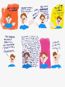 I downloaded a few different animation programs and began to experiment. I never found an ideal program, something as well-designed as Procreate is for drawing Most were for little kids and had clumsy interfaces that were very restricting. The best is called Animation Desk and I managed to wrestle a few little samples out of it.