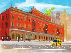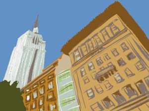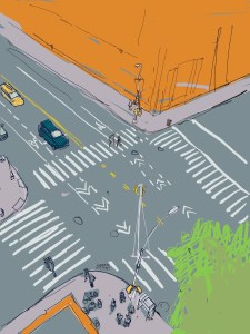 Two particular drawing that I did on while sitting on the curbs of the Village started to capture something new. One I drew of some NYU building on West 4th Street in bright cartoony colors. Then Public Theatre on Lafayette Street and finally a corner off Washington Square late at night.