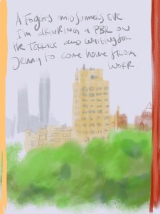 I‘d been studying Hockney a lot in the weeks before vacation and I was channeling his palette I’d spent an hour or two in the McNally-Jackson bookshop, poring through his new book called Current which contained hundreds of iPhone and iPad drawings. There’s a simplicity to each stage of his work which builds up to an intense richness to the final results. He attacks the screen with clarity and bold colors and keeps layering on detail. I tried to use a similar approach but I still didn’t dare to use colors as cartoony and bold as he did. Inexpertly done, they can just look garish and amateurish.