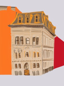 I started to work in block shapes in layered bright colors. In some drawings, I processed the layers to create unexpected effects. I even turned on brightly hues street scene in a study in shades of grey by just flipping a slider.