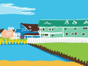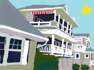 I didn’t feel like focusing on drawing sunbathers — I’ve done it before and it always makes me feel a little pervy. Instead, I wanted to draw the water and the sun-bleached houses, to continue the exploration I’d been doing with my urban sketches in Manhattan.
