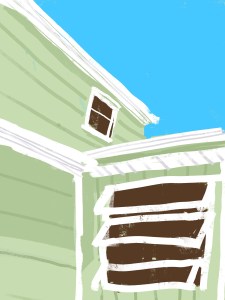 The last painting I made hinted at a new direction. I’d woken up early on the last morning in Surf City. The room was still dark but little fingers of dawn thrust themselves around the edges of the blinds. I picked up my iPad and started to construct the shapes of the window, the air-conditioner, the blinds, the bureau and then to suggest the variations in light. It was simple, crudely drawn through bleary eyes, but it was not a bad piece of observational drawing. I could still put aside style to draw just what I see.