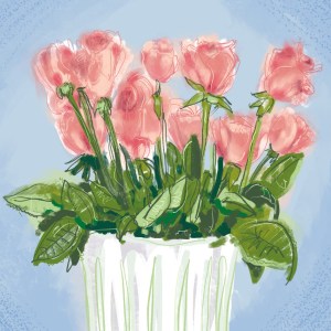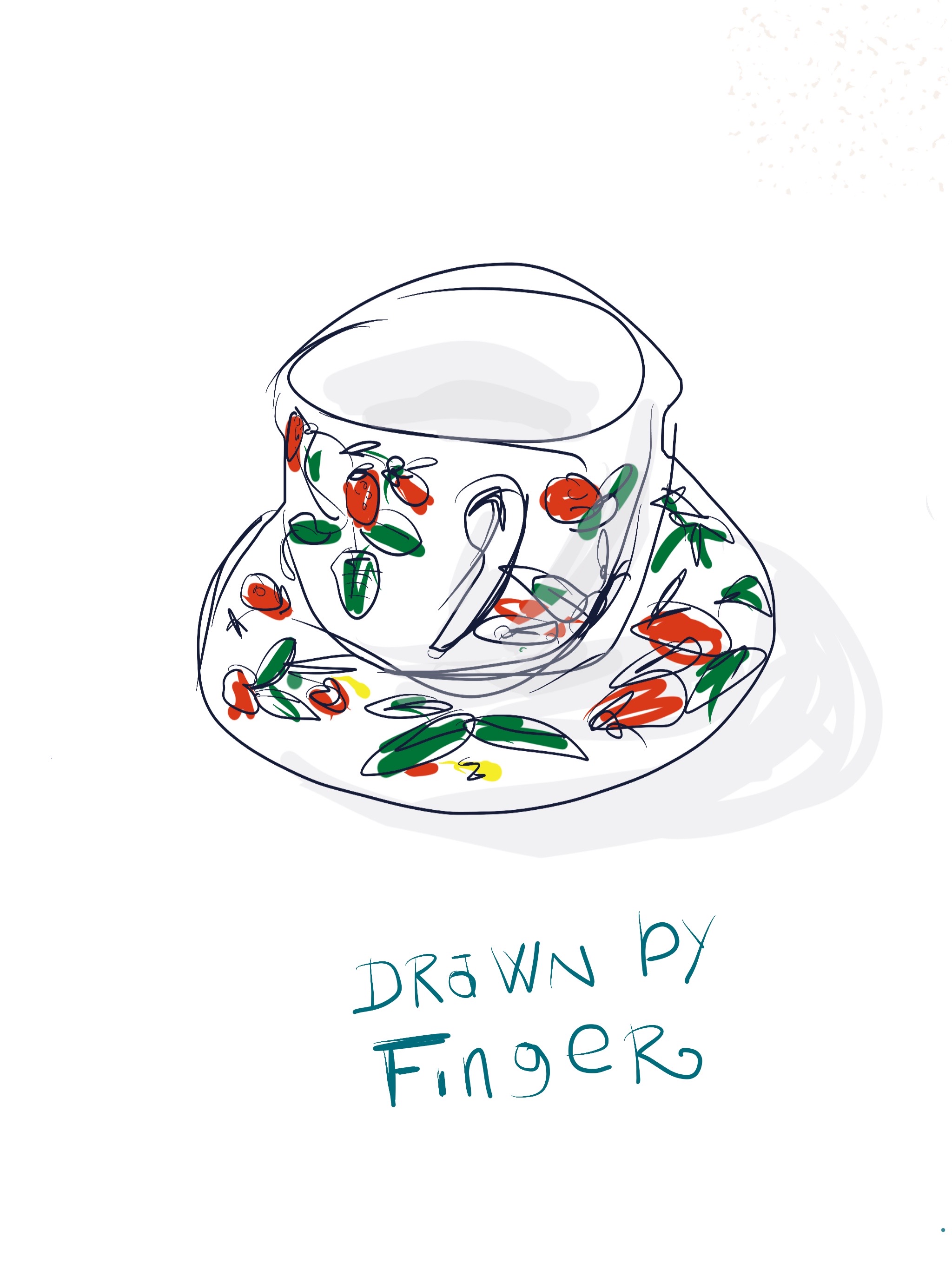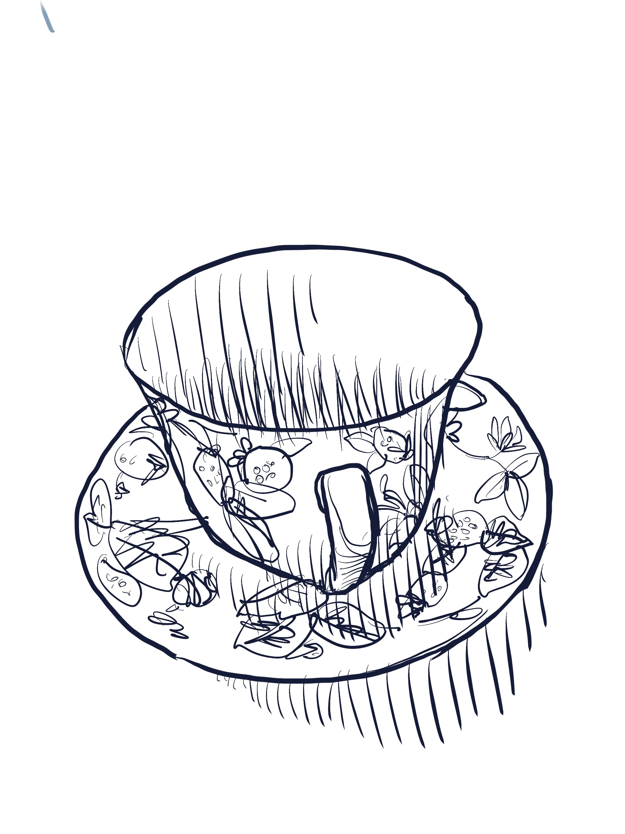 So I dialed back and just focused on just making a simple black line. I drew my most familiar subject, a floral tea-cup, which I had drawn dozens and dozens of times over the years. These drawings were familiar and comforting but were like driving that racecar in a school zone. I wanted to open things up, to expand beyond where I’d been and get comfortable using my new toys.