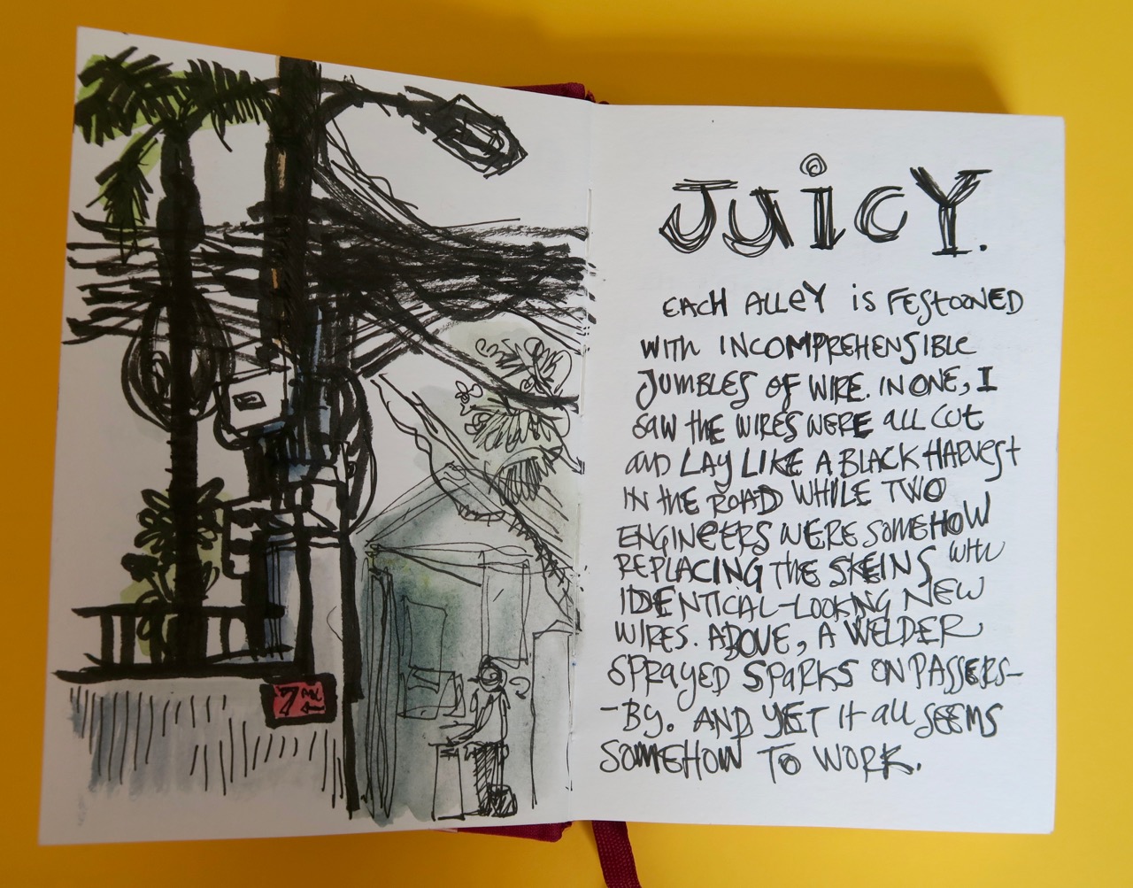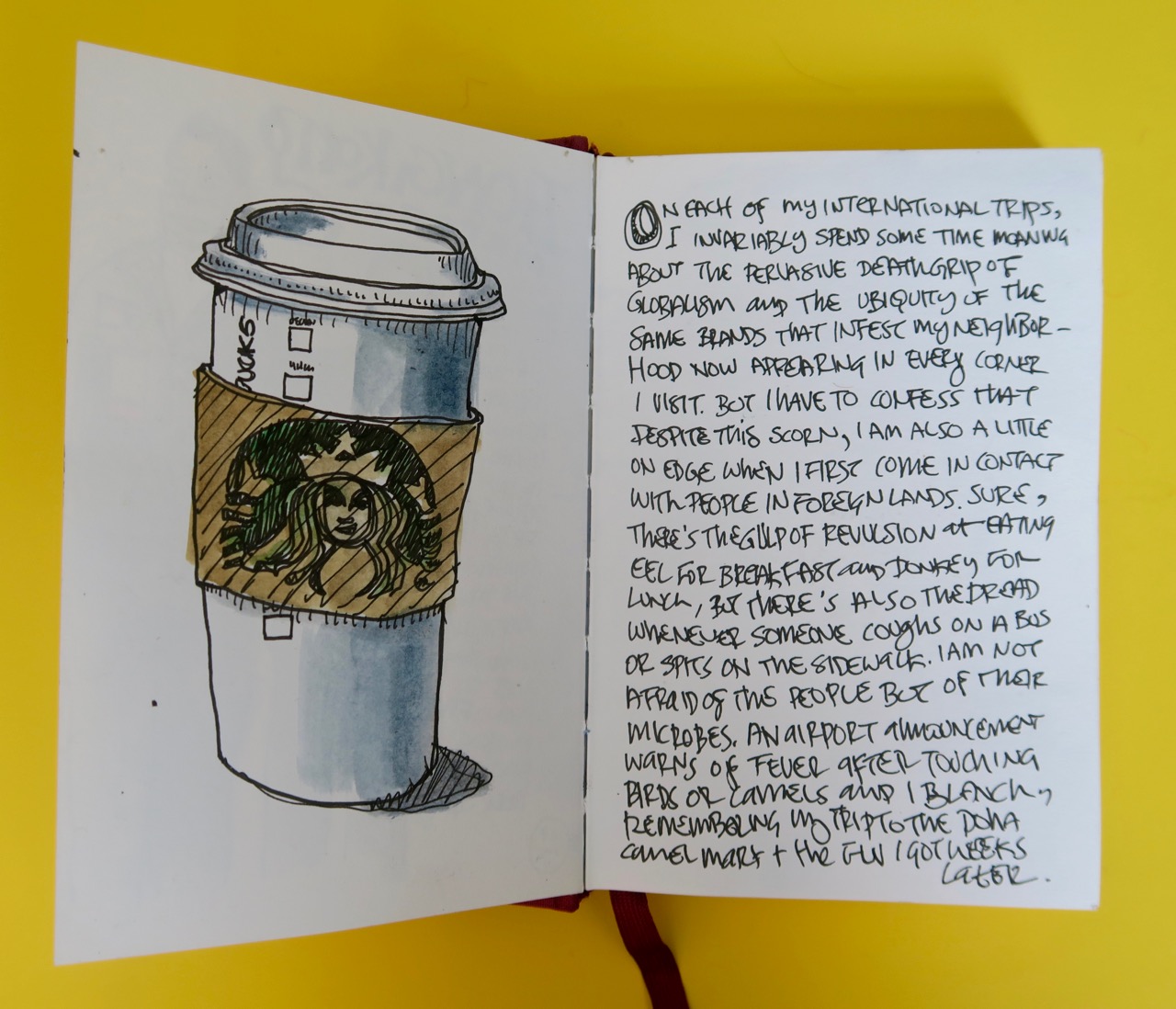 Being in a new place always open my eyes and ears. Everything is unfamiliar to some degree, a degree that inspires my record in ink to be deeper and fresher. My travel journals contain the richest pages on my shelves, the most experimental, the most free. Each day in a new city is both energizing and depleting. I strain every hole in my skull to suck in more and more information and end the day wrung out and deep in sleep.