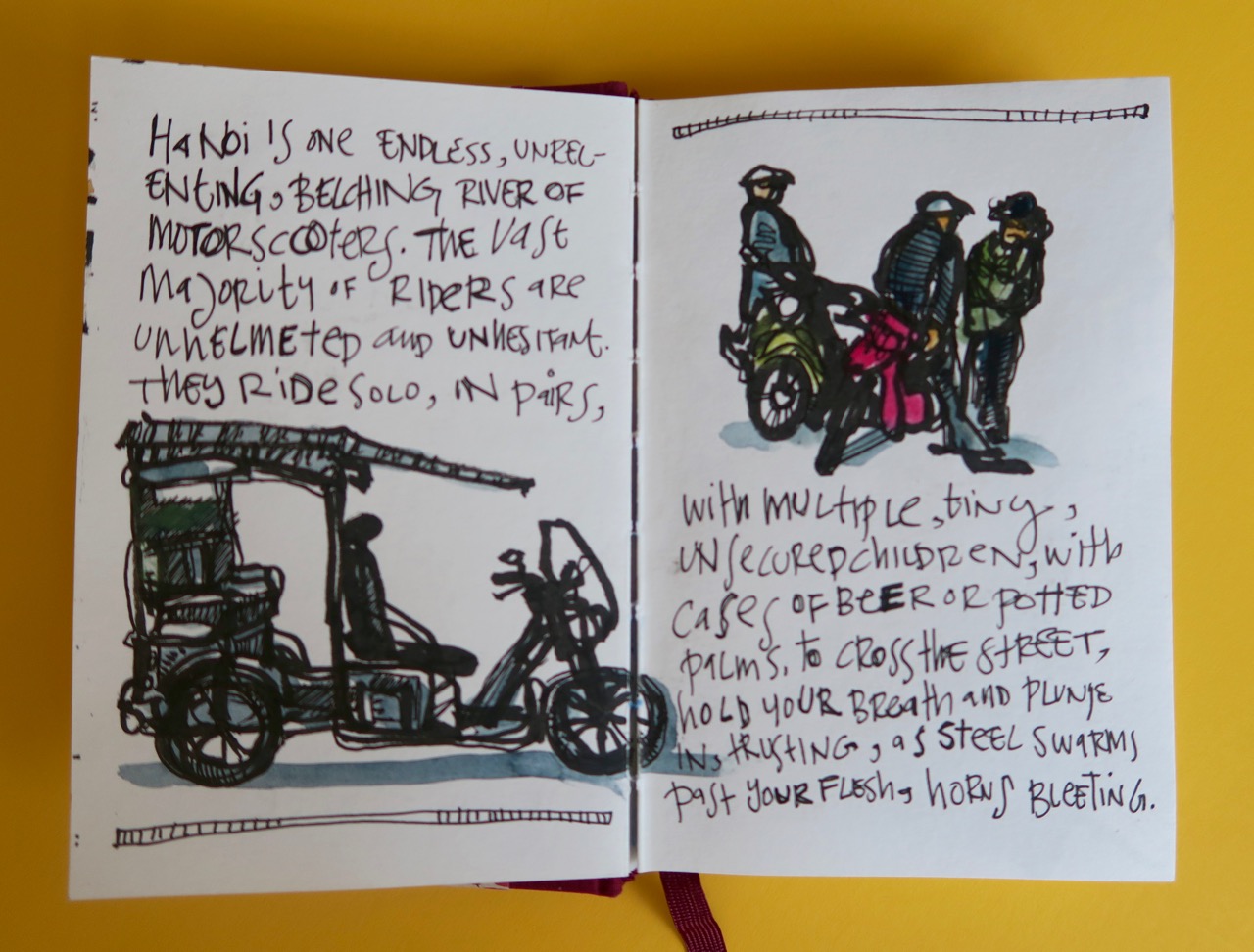 Scooters mosquito past all night and day, vast swarms of them stacked high with egg cartons, toolboxes, slim dogs, kettles of fish, and toddlers. If people wear helmets at all, they look to be made of plastic, covered with flowers, or manga characters, like inverted kindergarten lunch pails.