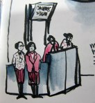 Next we gave them more specific assignments. Draw six things that are round but very different sizes, draw them the same size and arrange them evenly across the page. Draw a stack of books you’ve read in the library, giving them dimension, paying attention to the letterforms. Interview and draw one worker in the kitchen. Draw the place you’ll miss the most after you graduate. This was better, and they certainly did the assignments uncomplainingly, but much of the work was still sketchy and lacked passion.