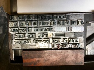 Next you have to decide how big the space should be between each word and locate the appropriate spacer. Then you put down some leading to separate the first line from the next, leading being a strip of lead which comes in different lengths and thickness. You determine the length by setting your longest line of copy and, if that line is in the middle of the page, you’ll need to measure it, then dismantle it so you can begin again with the first line of copy. You determine the thickness by deciding how much space you want between lines and how many lines you want on the page over all.