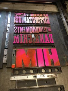 Two: I like making stuff with my hands, even if it’s slower and shittier than doing it on a computer. I like the physicality, even the back-breaking parts, and all the many serendipities that happen with analog production, the mistakes that occur and the ingenuity needed to correct or compensate for them. I like the beauty of the brass rollers, the copper slivers you slip between letters, the burnished old wood type, the lumpy mouths of the ink pots.