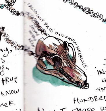 An aside: One of Patti’s many nicknames was ‘Hoofy’ for her occasionally clumsy ways. This is a drawing of a necklace I gave her years ago, a collection of silver feet and hoofs. She loved it and wore it a lot. It makes me wonder: will I ever know anyone else whose tastes, weird and particular, are so in tune with mine? Who else could appreciate and encourage my taxidermy collecting, my medical textbooks, my love of sardines on toast? How do you replace a one-of-a-kind treasure?